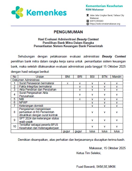 Pengumuman Hasil Evaluasi Administrasi Beauty Contest Pemilihan Bank Mitra